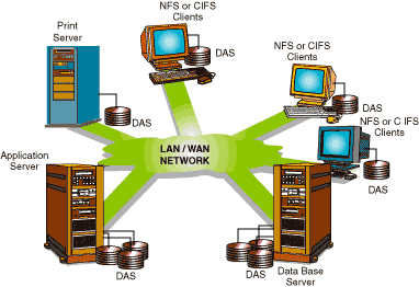 ระบบ DAS ที่กล่าวมาข้างต้น (แสดงในรูปที่ 1) เป็นระบบที่เคยถูกนำมาใช้ในการตอบสนองความต้องการในการจัดเก็บข้อมูลโดยมี หลักการทั่วไป คือ การเชื่อมต่ออุปกรณ์ในการจัดเก็บข้อมูลเสริมเข้ากับเครื่องคอมพิวเตอร์ทั้ง แบบภายใน (Internal) และแบบ Point-to-Point